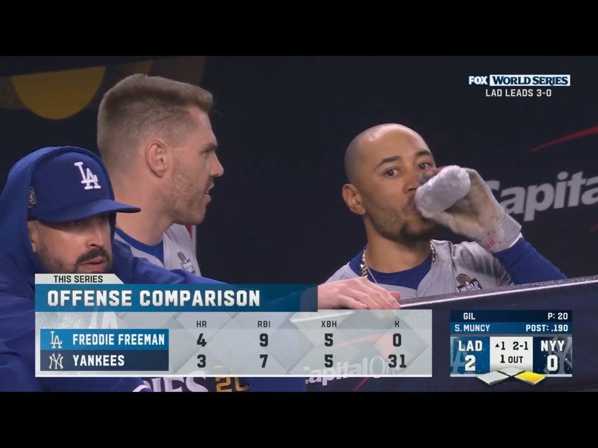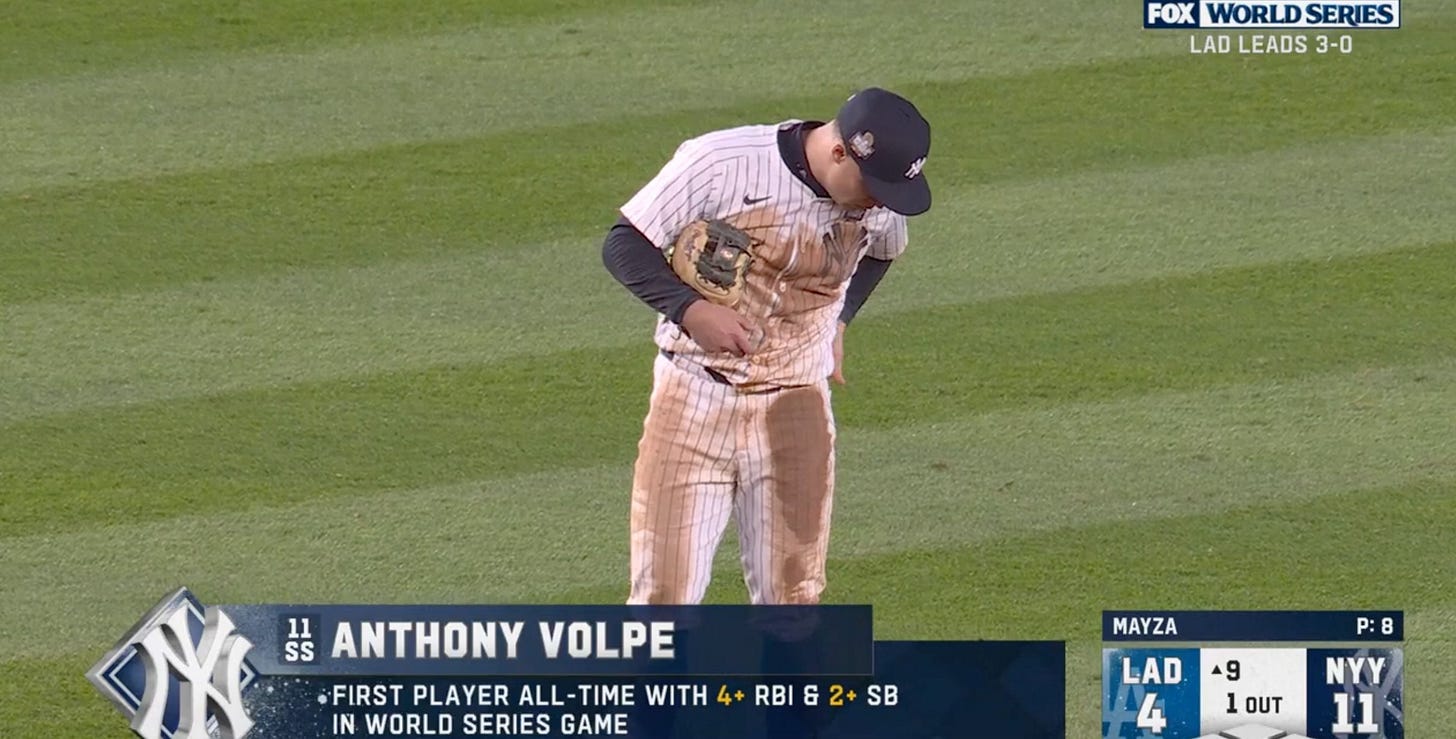 The Yankees came alive even more in the 8th with a Torres homer. The bottom of the order got a lot of it done, but even Aaron Judge got a base hit and an RBI. I want to be very clear, the highlight for me was a bottom of seven sneaky hot dog and not the Yankees being let off the mat. It was nice to see former Jay Tim Mayza pitch a clean top of the 9th to close it out and force a Game 5. Just like Freeman’s record, Volpe is the first player with 4+ RBI, and 2+ SB in a World Series. Stats are just amazing.
