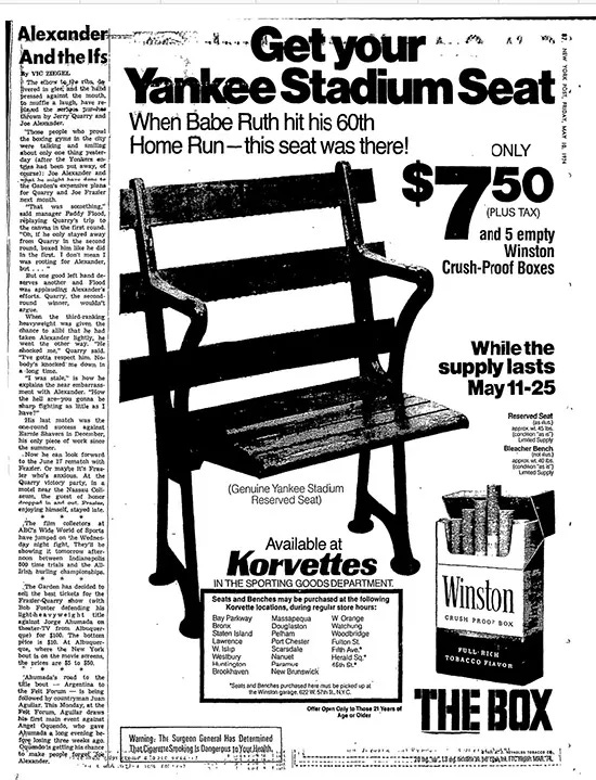 I loved seeing this ad to get your seat from the original Yankee Stadium - and your 5 empty Winston cigarette crush proof boxes. And this story about this ad from Mike Vaccaro.