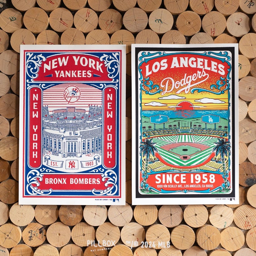 Absolutely gorgeous art prints from Pillbox Bat Co. x "Baseball's Finest" For the Yankees and the Dodgers.