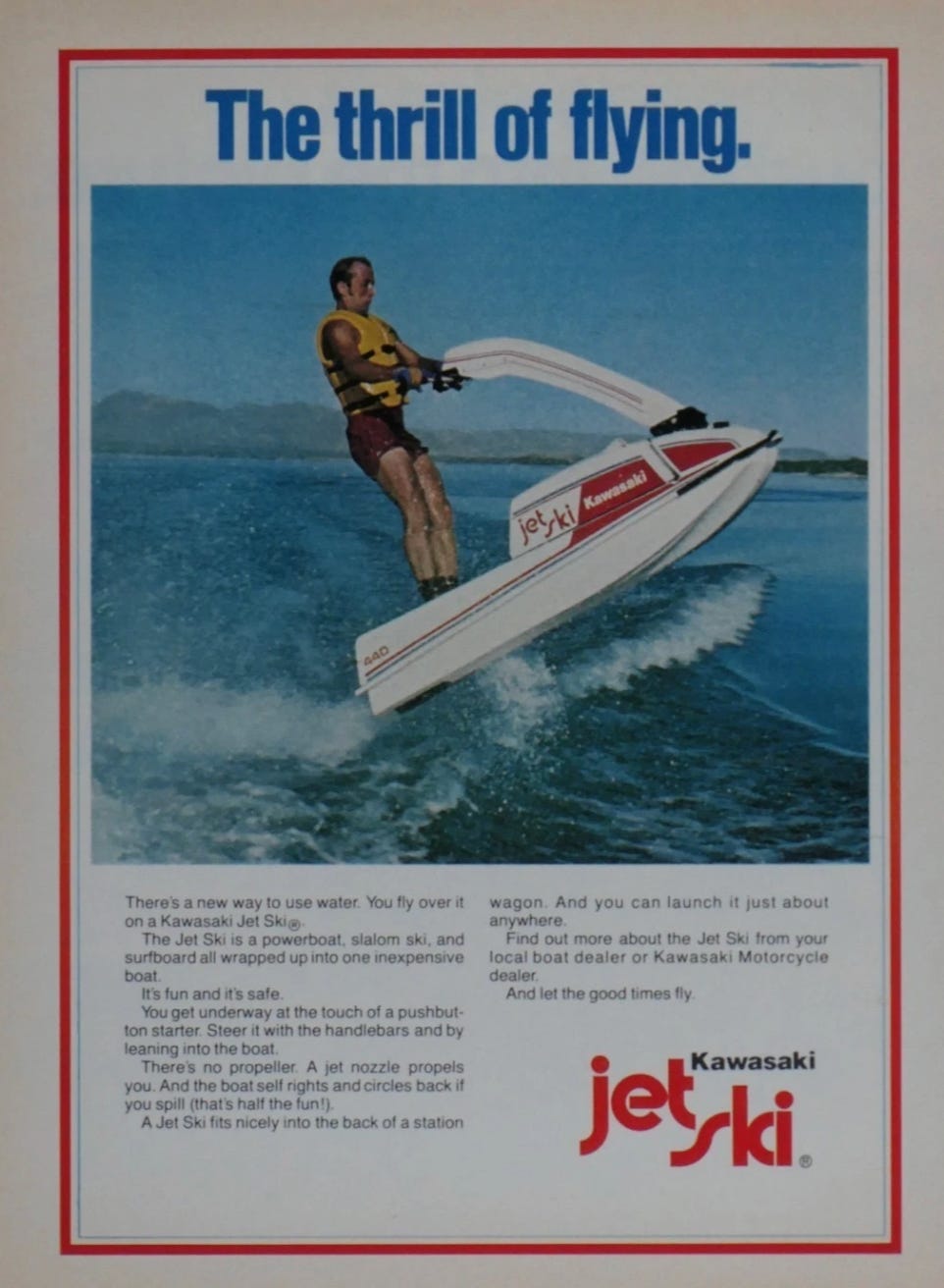 Kawasaki didn’t actually invent the personal watercraft. Bombardier did. The first sit-down Sea-Doo hit the water in 1968, and by 1970 they had a TV commercial running coast to coast featuring the 1969 model riding around with bottles of Fanta.