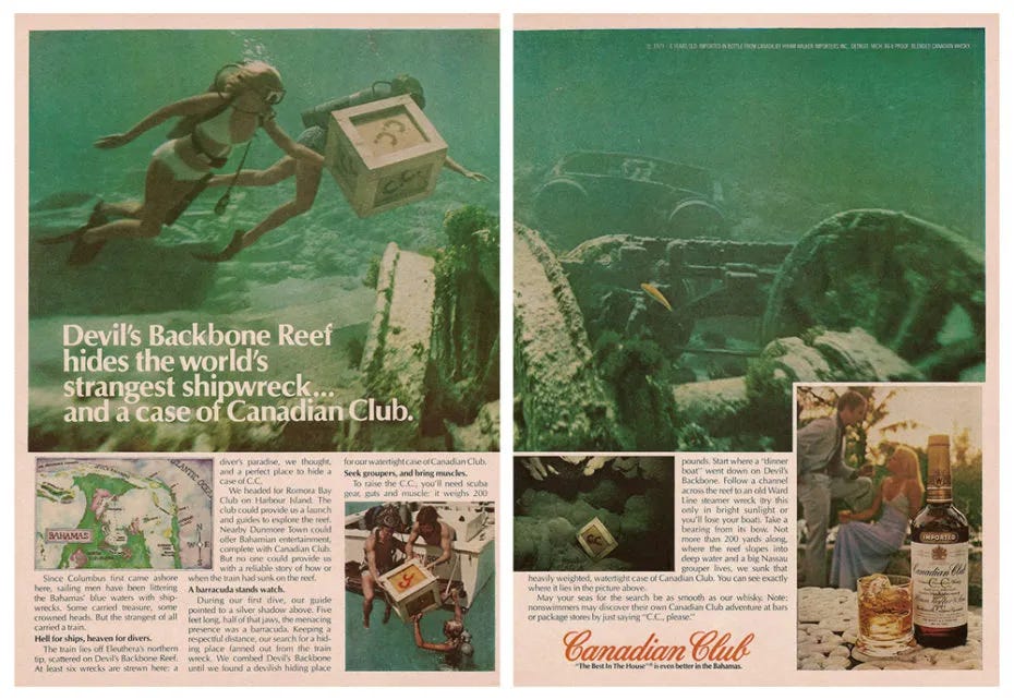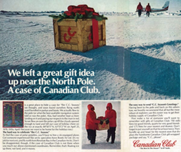 The ads ran in Life, Look and Playboy. The copy on one read “We left a great gift idea up near the North Pole. A case of Canadian Club.” Another: “Devil’s Backbone Reef hides the world’s strangest shipwreck... and a case of Canadian Club.”