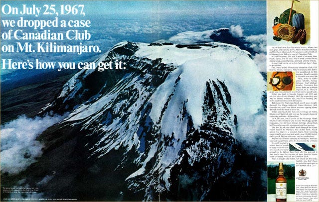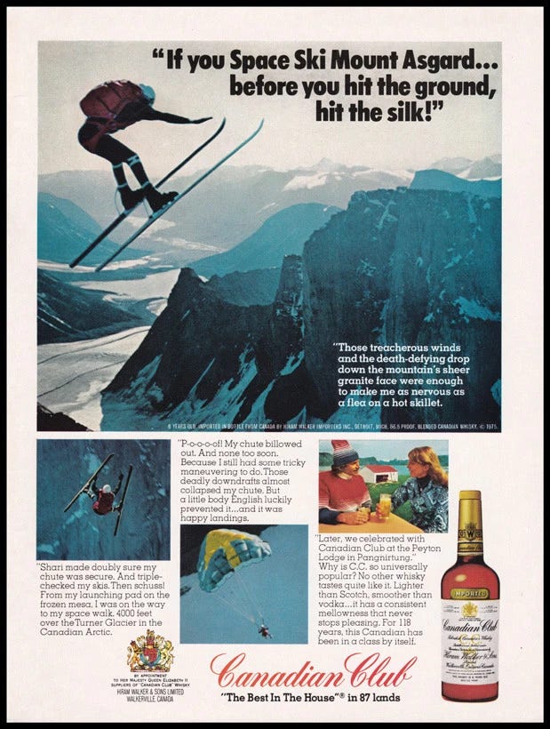 This ad is part of the Canadian Club “Adventure Series” — a campaign that had already been running. Same formula every time. Some guy does something insane in a beautiful place, survives it and drinks a Canadian Club afterward.