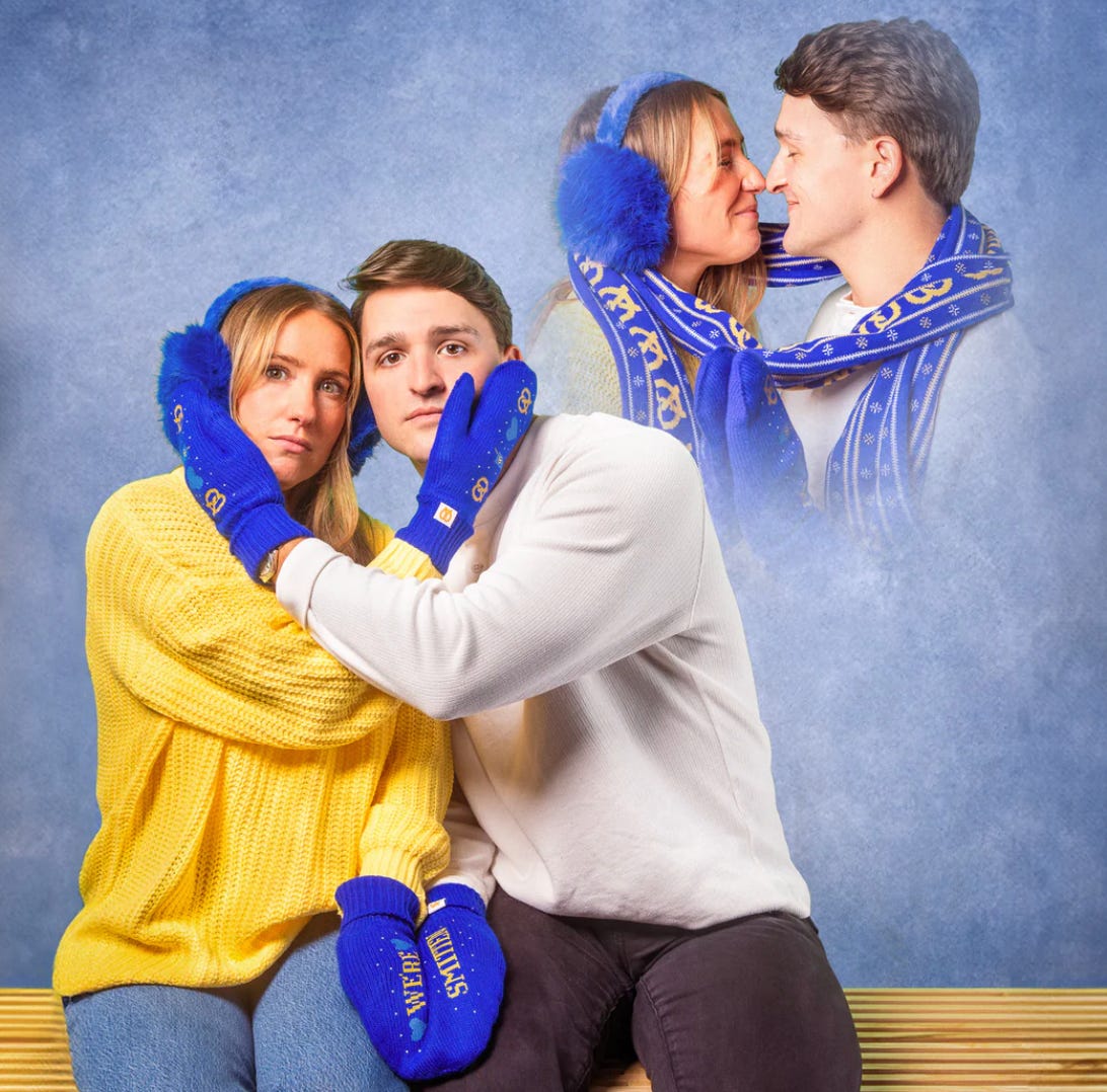 And not to be outdone, Auntie Annies, yes the pretzel company, launched their new Together Tether Scarf along with a pair of Sparkleberry Smittens and the most cringe worth Sears portrait studio shots you’ve ever seen. They didn’t even have the decency to go all in and hire Zach Woods (aka Jared from Silicon Valley) for this over a pale imitation Jared.