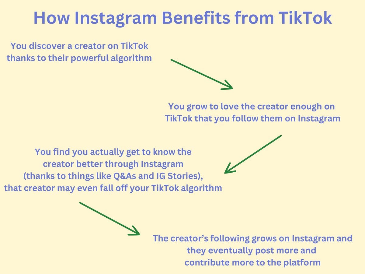 “the tiktok ban will be bad for the entire social media ecosystem, even the platforms we think will “benefit” from its disappearance. its discovery-focused algorithm acts as a feeder of followers, creators, and culture. other social media platforms rely on it more than we think.”