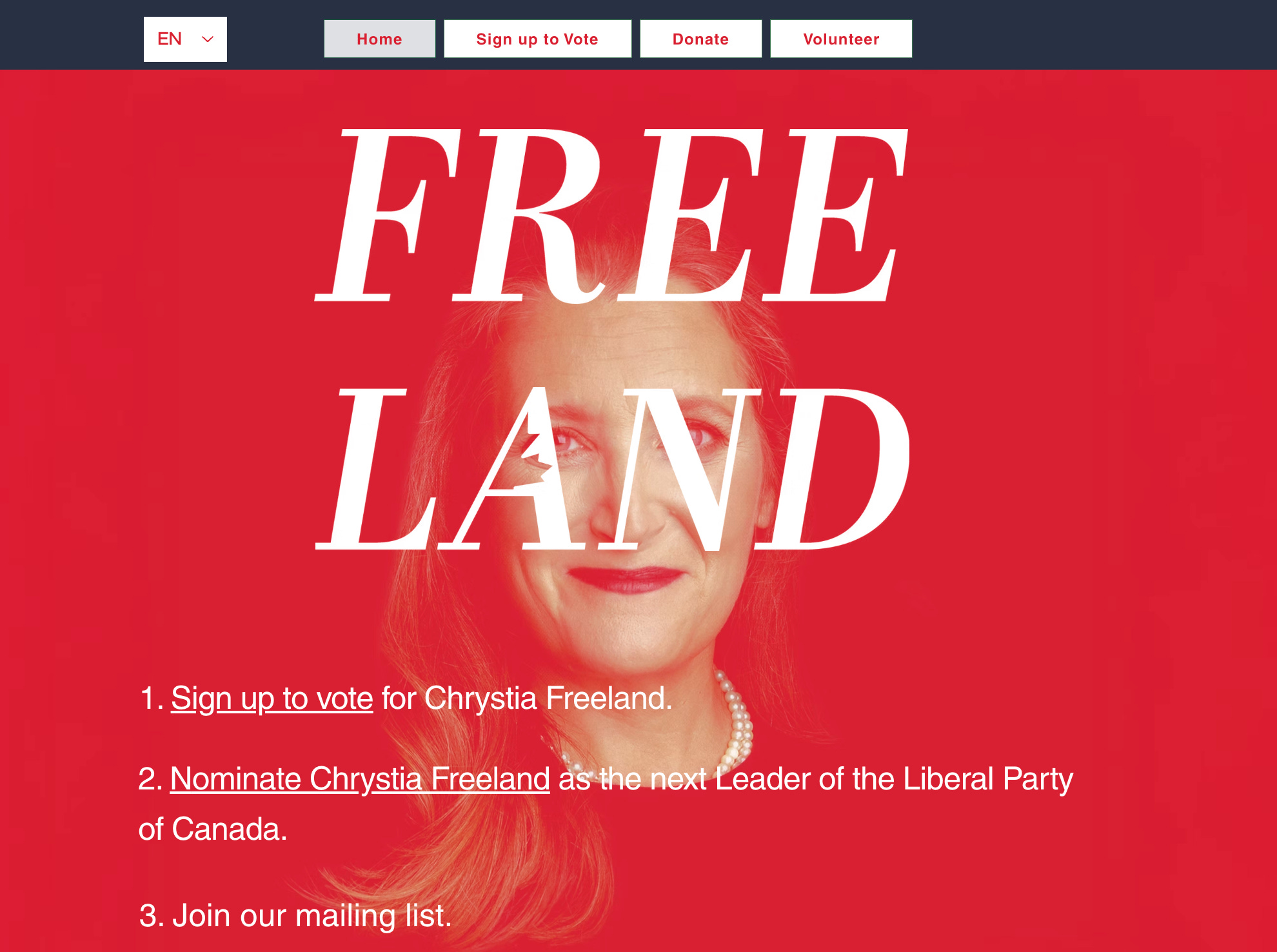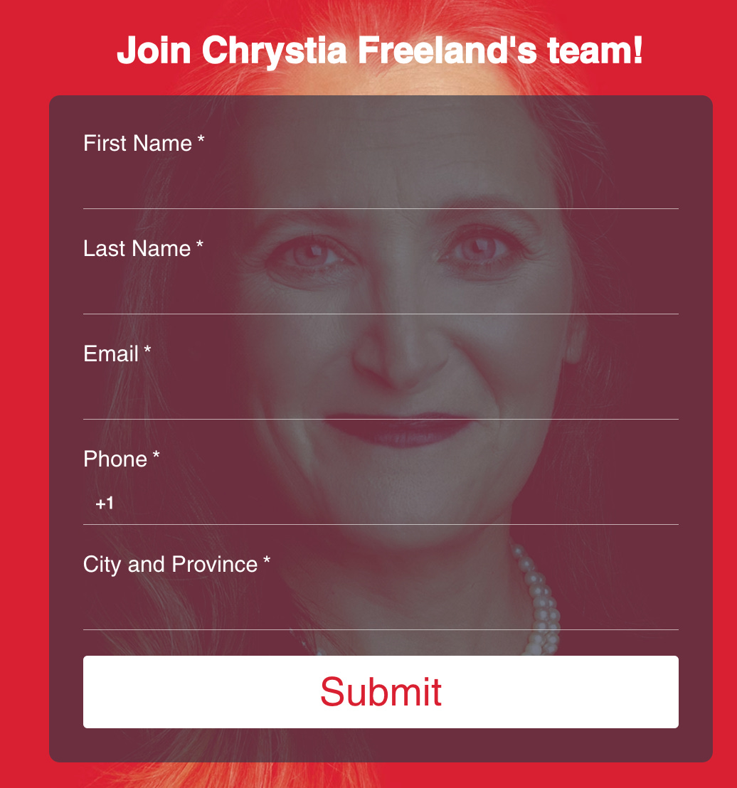 Chrystia Freeland’s website is an exercise in rushing the assignment. At least Carney tried to share his biography. The website is 3 buttons and what can only be described as the most intimidating form I’ve seen in over 20 years of making websites. No joke, the donate form also features her watching you. There’s no biography and absolutely no policy information.