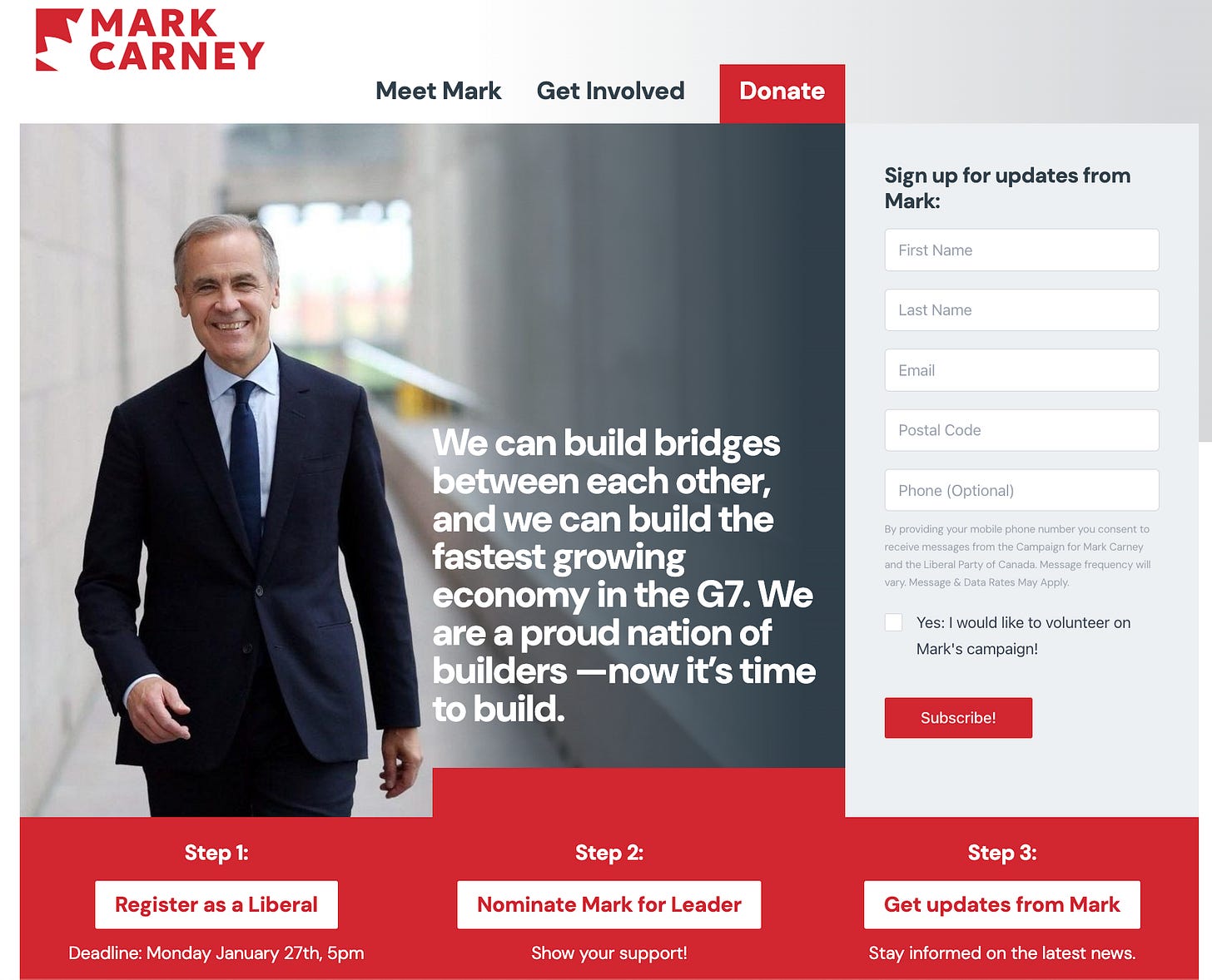 Mark Carney’s website is basically a chaotic form with five buttons all located in the home page hero area. An extremely long headline. 3 steps. Oh, and did I mention the image is a slideshow too? This is a conversion nightmare with a vague sense of branding. I feel like I’m grading on a curve and still being too generous with this score. I’ll give him a point because his donation flow is actually nearly modern - but would it have killed them to get a photo of him looking at one of the buttons? This is easy win stuff. 4/10.