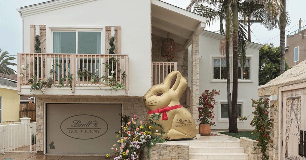 And bonus Easter-themed hate goes to the Lindt chocolate. They are celebrating the big day with a home rental in Carlsbad, California for 3 days. According to Adweek, “The destination is full of bunny-themed and gold décor and stocked with a hare-raising amount of the brand’s signature Lindt Gold Bunny chocolates, Lindor chocolate eggs and new Gold Bunny filled offerings in double milk and hazelnut flavors.” With the price of chocolate in this economy, that’s pretty great.