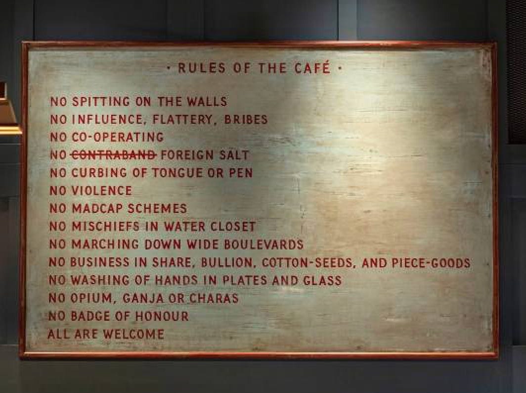 I saw these cafe rules from various outposts of Dishoom. I was taken by the one that says “No madcap schemes.” But today seems like a wonderful day for a madcap scheme. See you next week my Drink Carting friends and cocktail enthusiasts. Don’t wash your hands in your glass please.