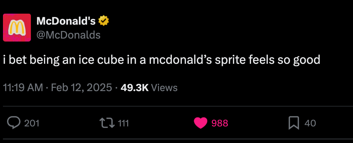 That was a wild way to say I wanted to get in a few more notes in on the big game. But here we are. Trust the process. I know, it’s four days old, but these two nuggets are too good not to share. Never fear! I’ll make it go down with a great post from McDonald’s I can’t stop thinking about. It’s just so stupid and too good. Goes right to my dopamine happy place. Oh, and so true. I’m a Sprite guy.