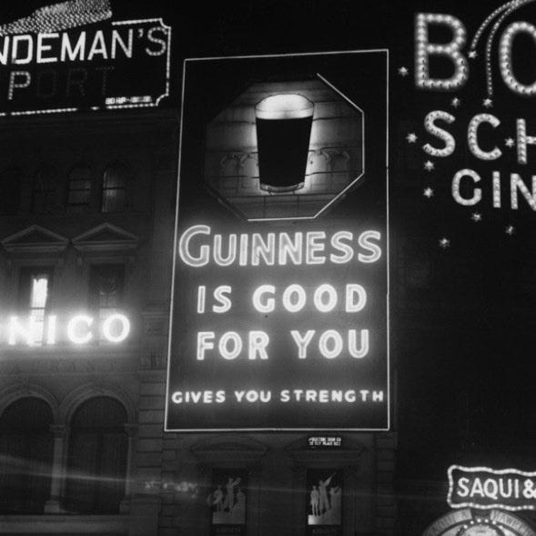 I can’t decide if I prefer the Surfer ad’s line, “Good things come to those who wait” or this old neon sign’s “Guinness is good for you. Gives you strength.” Both are incredible. And I would love a version of that sign in my apartment.