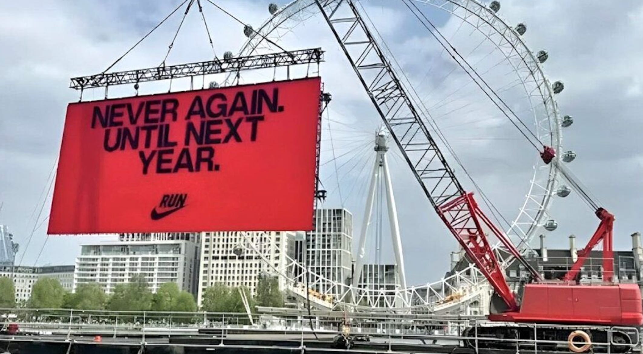 On the other hand, the brand is probably less mad at the Lakers and more mad about this London Marathon billboard controversy. Not much more to say about using the phrase “Never Again” with stark black and red that if you thought about it for even a few moments you’d probably think about National Socialism.