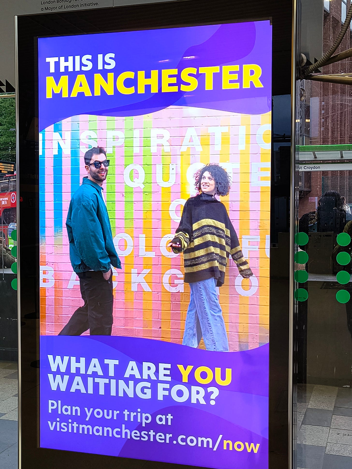 I love that people are shredding this amazing tourism campaign from Manchester. Despite it feeling like an AI ad with an error background, the campaign took photos in front of a real mural that said, “Inspirational quote on a colourful background.” That’s the whole campaign. Even on the landing page. So great.