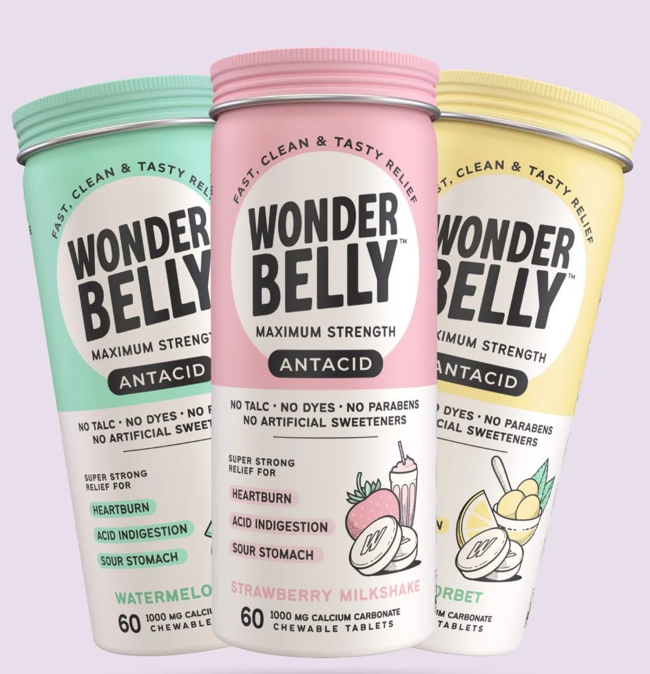 Of course Wonder Belly features antacids in the following ridiculous flavours: Strawberry Milkshake, Tropical Fruit, Fruity Cereal, Lemon Sorbet or Watermelon Mint. My only comment is this: It’s 2047, there are 74 brands of antacids fighting for limited shelf space in the great upset stomach wars. I’m so in the tank for big antacid all the way. Last note: antacid and gut health social media is absolutely wild.