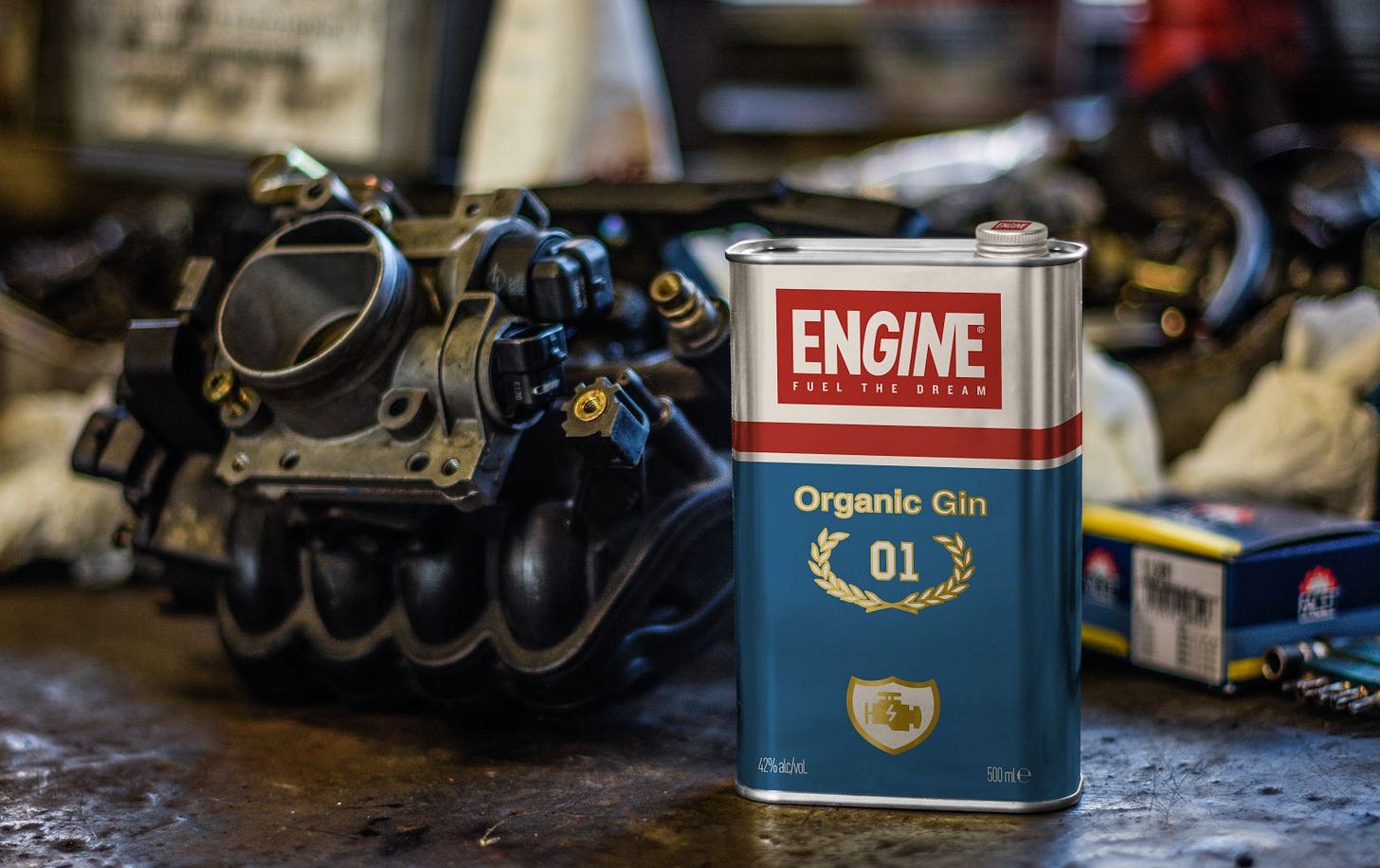 It’s all in that inspiration in the about section cut from some sort of mood boar, “Engine celebrates an imaginary made of oil and fuel cans, motocross races and racing vehicles, in memory of the great myths of the 1970s and 1980s like the timeless Ford custom-painted Gran Torino from TV show Starsky and Hutch or Clint Eastwoods 1972 Ford Gran Torino. From the world of cars, straight into your glass.”