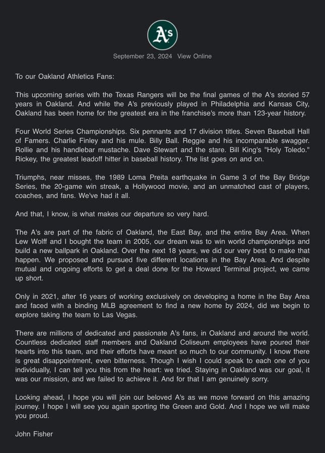 Right to the last series, Fisher has gaslit the city and fans saying he tried his best, but somehow couldn’t build a new stadium, so the team has to leave. No wonder fans are holding up signs with the timecode for the specific scene in Ted Lasso where Rebecca goes ham on the other club owners. As one fan was overheard saying on the second to last game in Oakland, “It’s like a playoff game crossed with a funeral.” The fact that this hat was on sale this week tells you everything you need to know about the owners of the A’s.