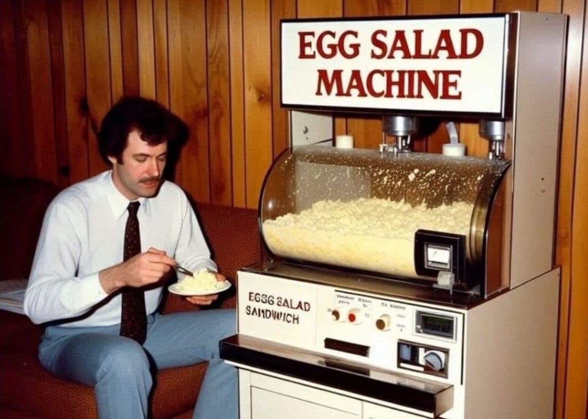 I’ve seen people talk about this Egg Salad machine photo quite a bit. Everything about it is everything that is wonderful about AI.