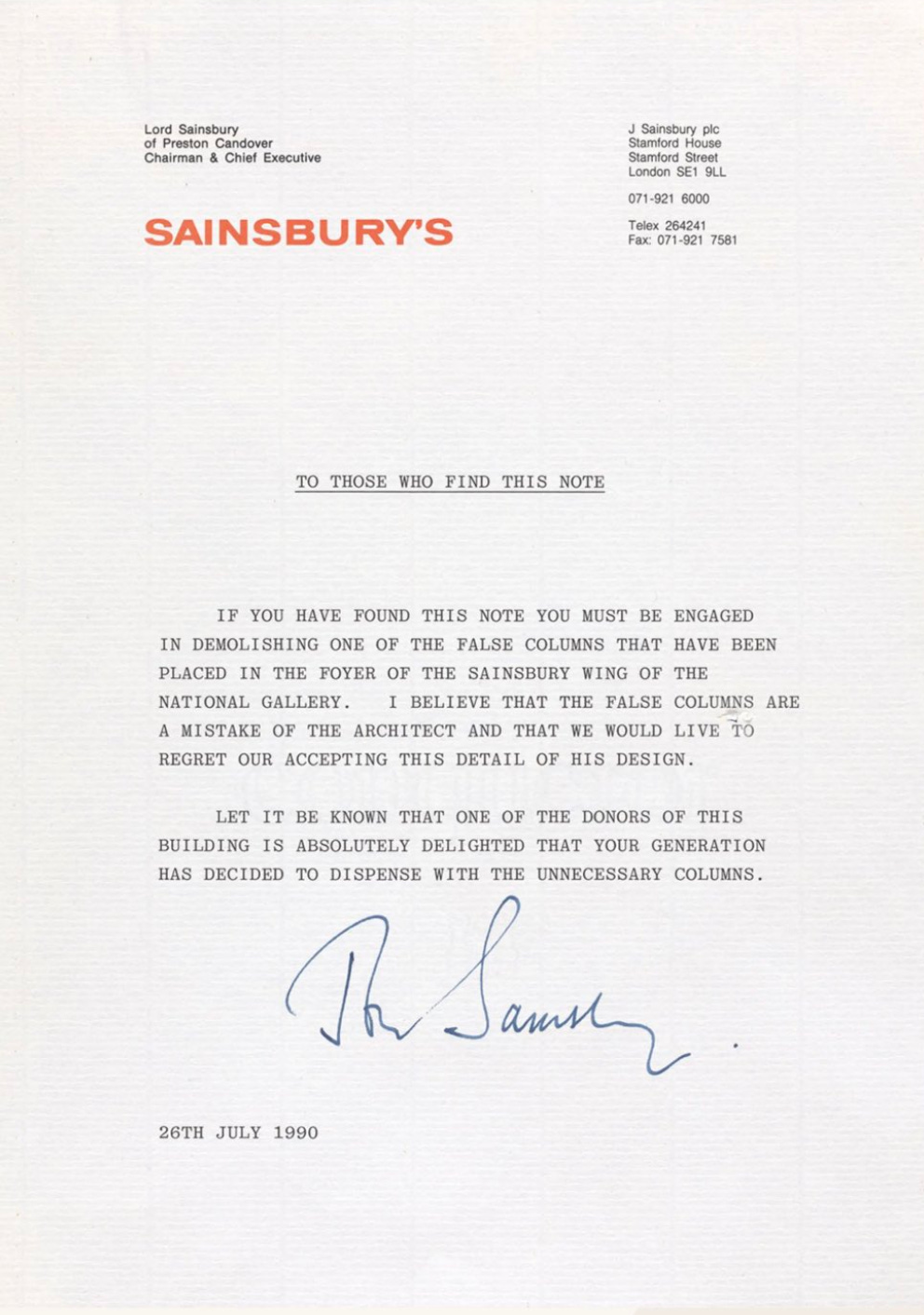This is absolutely the best. Apparently London’s National Gallery is doing some renovations of its Sainsbury Wing. While doing that work they unearthed a secret letter from one of original donors inside a concrete column. Basically the letter says that the columns always sucked and he’s glad they are being demolished. That’s a level of pettiness and long-game that we should all admire and work towards.
