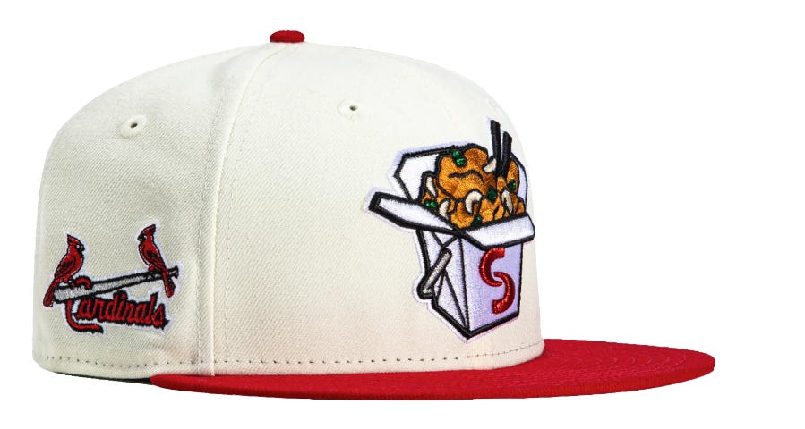 Finding a hat this week was a struggle. But then this Springfield Cardinals Cashew Chicken hat came in clutch like a Freddie Freeman walk off grand slam. This 2023 alternate hat commemorates the 60th anniversary of the invention of Springfield Style Cashew Chicken - a combo of fried chicken, cashews, green onions and a savory sauce. There is not enough hats featuring take out food - and take out containers.