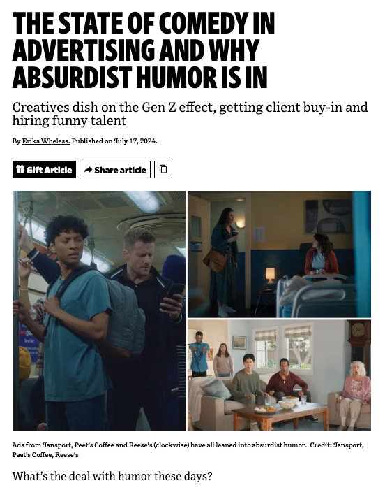 Guess what, comedy is changing as it tries to keep up to speed of culture, memes and Gen Z. So Gen Z like “internet humour” and absurdist humour over slapstick. That smaller is better than bigger when it comes to playing for comedy. And that everything is faster so by the time you make ads, the joke or meme has died. Sounds about right.
