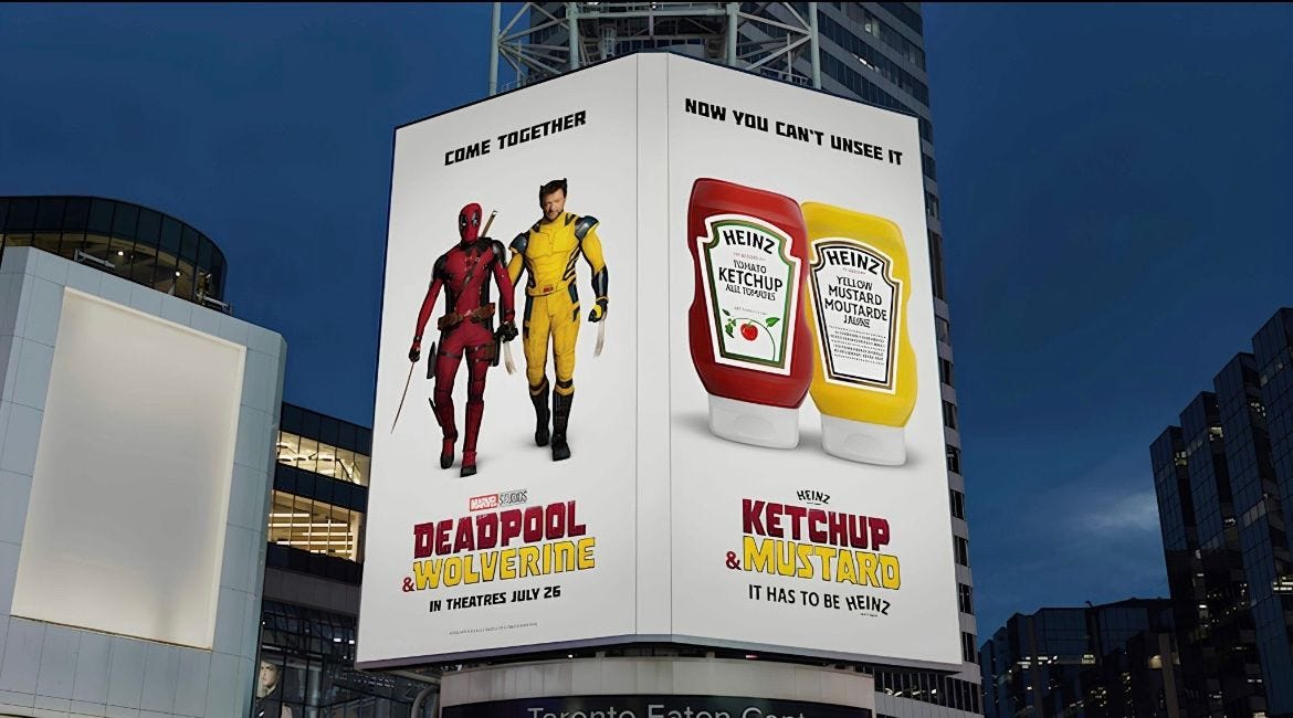 Which explains why tie ins for Deadpool & Wolverine’s marketing just leave us even hungry for more because the characters are red and yellow - Whoa! Just like Heinz ketchup and mustard. OMG. And they called them that on set too! And if you don’t think this is slop imagine this line from Marketing Dive: “The condiment maker is hoping the color of the characters’ superhero uniforms — red and yellow, respectively — will remind consumers of the classic ketchup and mustard combination as summer cookout season remains in swing.”