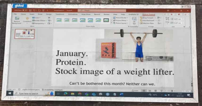 The example they shared for Surreal is a fun one. “Screenshot of PowerPoint on a billboard, lolwut? Hilariously bad graphic design. Purposely lazy, fourth-wall breaking ad copy. This campaign went mega-viral as a result.”