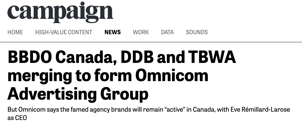 The agency business is funny, right? They work for brands and are brands. But also maybe kind of hate brands too? This story covered in Campaign and Strategy Magazine about merging the BBDO, DDB and TBWA brands into one powerful and very inspiringly-named “Omnicom Advertising Group” is typical agency vibes.