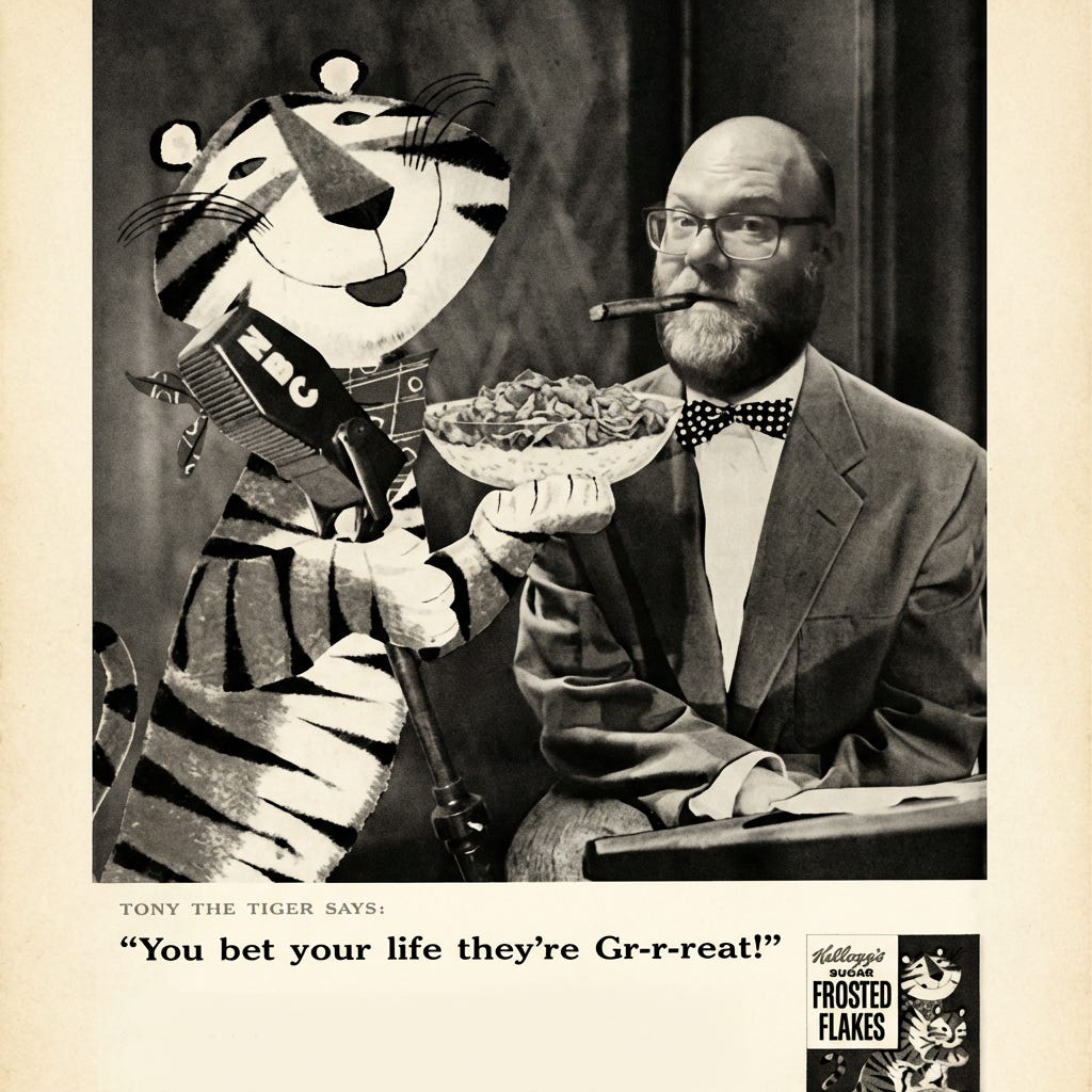 That deep bass that would embody Tony for five decades. It’s not settled canon whether it was Ravenscroft or copywriter John E. Matthews who came up with the signature, "They're grrreat!" line.