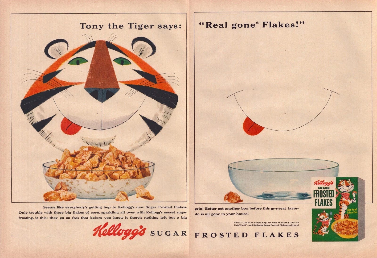 But Tony was destined to be a star. (Also listen very carefully to that ad where they say you need milk or cream. Let me get this straight, people where just out there eating cereal with cream?).